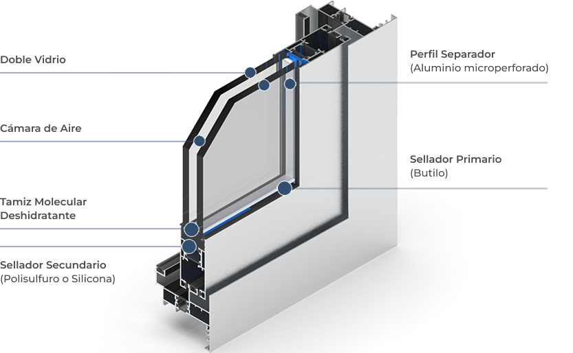 Consiste en dos o más placas de vidrio separadas por una cámara de aire o gas, sellada de forma hermética.